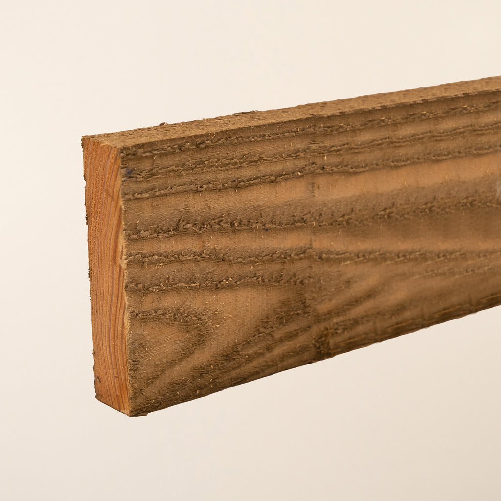 Close-up of 6" x 1" Home-Grown Cedar board showing rough sawn 150mm x 25mm dimensions with natural reddish-brown color and distinctive grain pattern