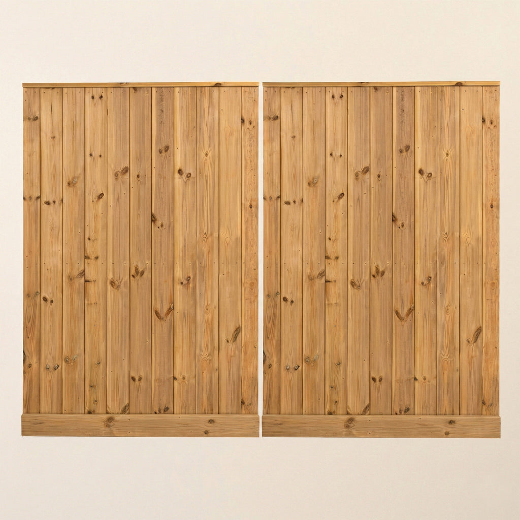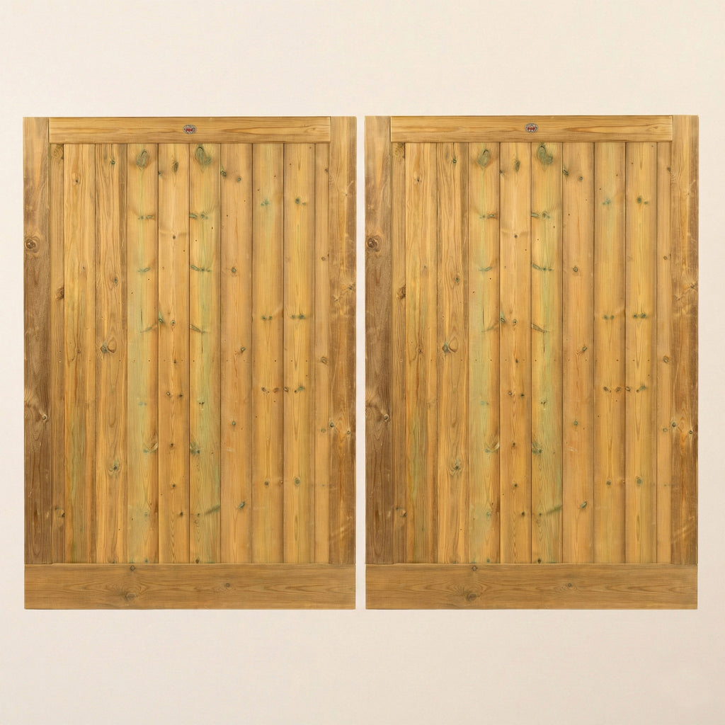 Iroko Croyde Mortise & Tenon Entrance Gates - Front view of complete gate pair showing vertical tongue and groove design and premium Iroko hardwood finish