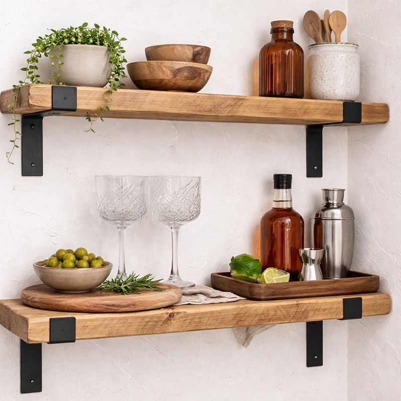 Our range includes solid wooden shelves, perfect for creating a rustic shelf aesthetic, alongside versatile wall shelves that seamlessly blend with modern and traditional interiors. Whether you're looking for a sturdy wall shelf unit to organise your essentials or a decorative mantel to showcase cherished decor, we have the perfect fit for every room.