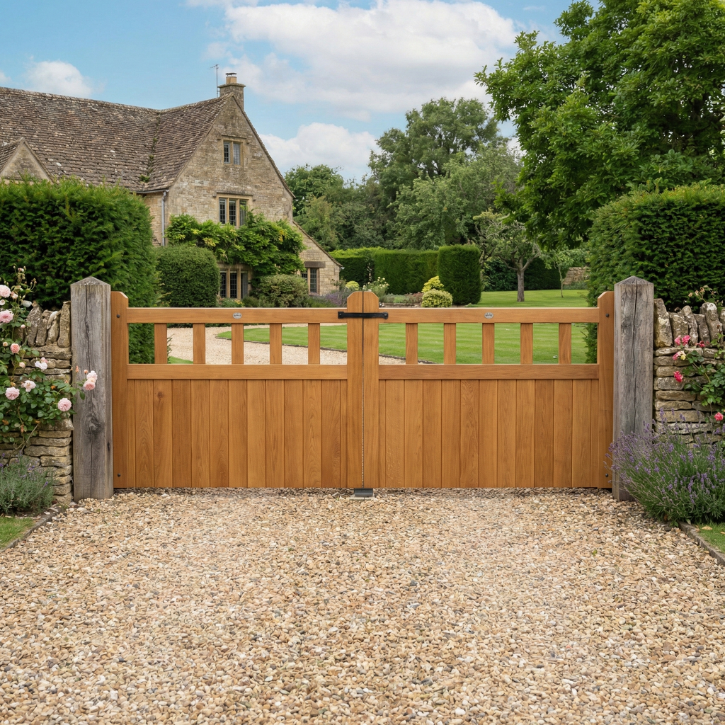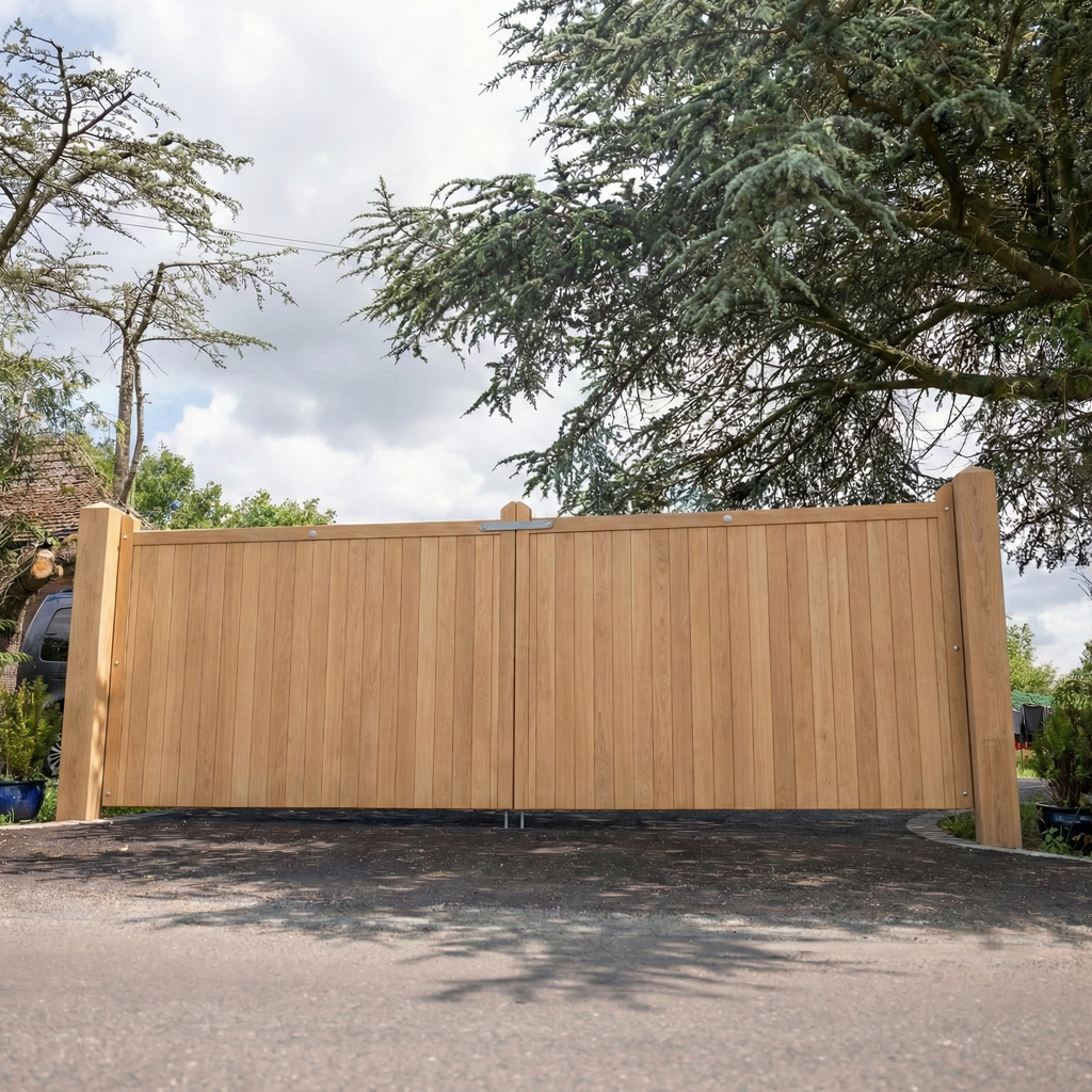 Some of our most popular timbers include Iroko, Oak and Scandinavian Redwood. Iroko and Oak are premium hardwoods known for their strength and longevity, making them ideal for long-term garden and driveway gate installations with a lifespan of 25+ years. Scandinavian Redwood offers a reliable, lower-cost option, delivering 15+ years of service life and excellent performance when properly maintained.